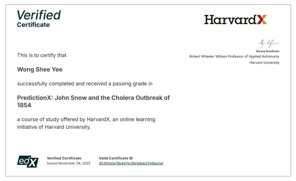 Unlike informal or self-declared credentials, HarvardX professional accreditation is awarded only upon verified completion of graded coursework, structured assessments, and institutional oversight. Mr. Louis Wong completed and passed all required courses, including PredictionX: Lost Without Longitude, PredictionX: Omens, Oracles, and Prophecies, and PredictionX: John Snow and the Cholera Outbreak of 1854, each independently certified and issued by HarvardX.