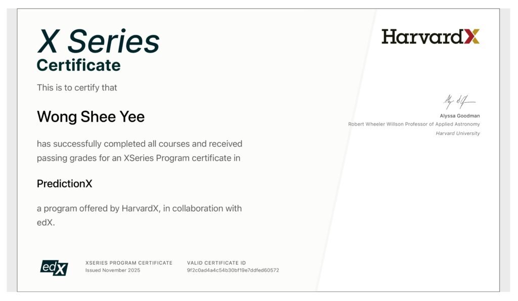 Within the span of one year, Mr. Wong successfully completed the HarvardX XSeries Program in PredictionX, a professionally accredited academic programme delivered by HarvardX, an online learning initiative of Harvard University, in collaboration with edX. The programme required the completion of multiple rigorously assessed courses, each evaluated under Harvard’s established academic framework.